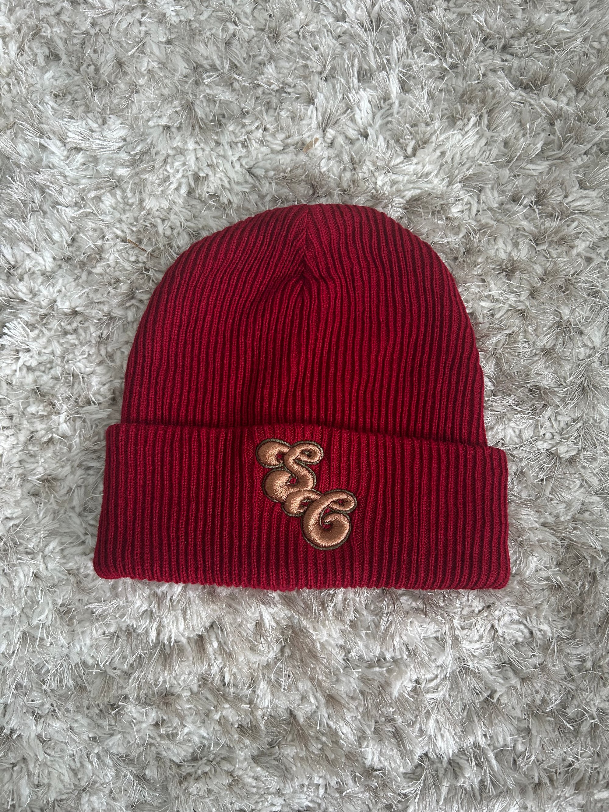 Burgundy Beanie Light brown logo W/ Olive green outline